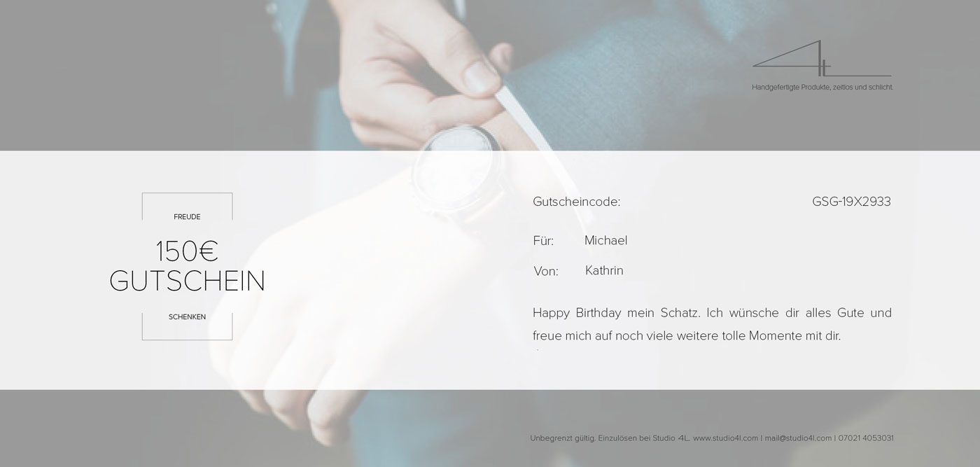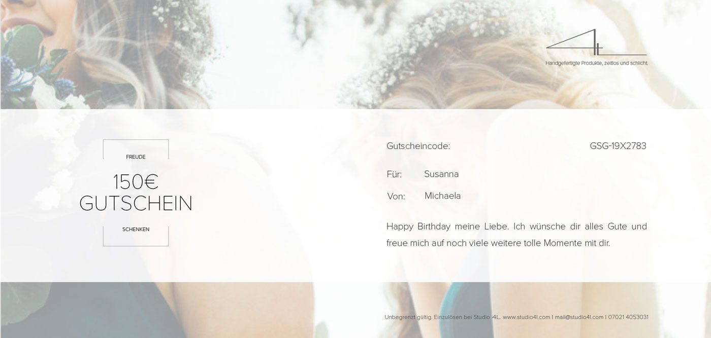 Mit einem Studio 4L Gutschein im Wert von 150 € Freude schenken und deinen Lieben eine Freude machen. Du bist unsicher, welches Produkt du als Geschenk überreichen sollst? Oder du bist auf der Suche nach einem kurzfristigen Geschenk für deine Lieben?
