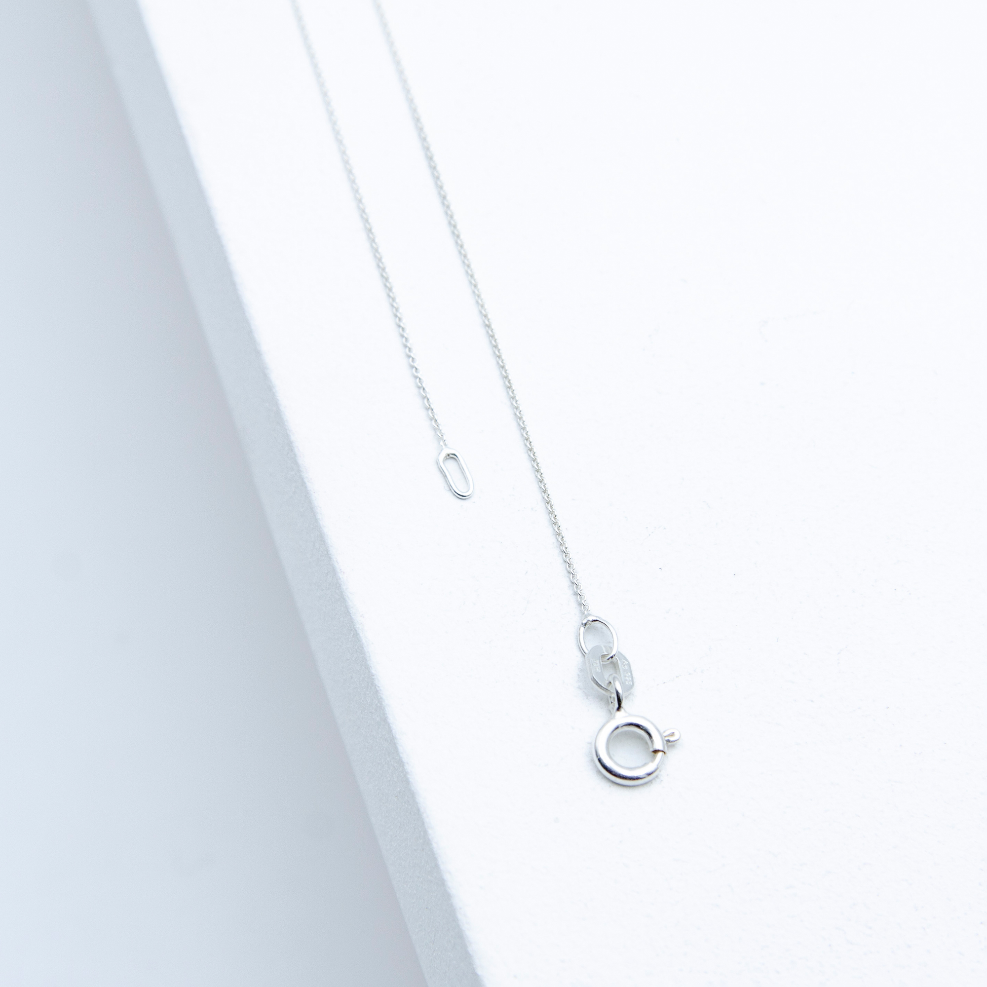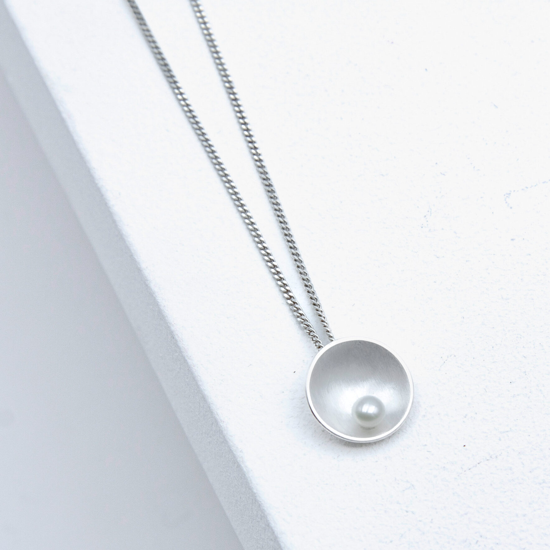 Ein runder, sanft gewölbter Anhänger aus massivem 925er Silber (Ø 10 mm), seidenmatt gebürstet und mit hochglanzpolierten Kanten. Dieser Kontrast verleiht dem Schmuckset Tiefe und sorgt für eine ausgewogene Balance aus Struktur und Glanz.